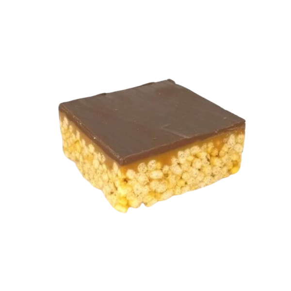 Square crispy base, with a salted caramel layer topped with chocolate