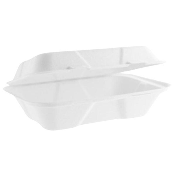 Biodegradable rectangular hinge lidded takeaway box suitable hot or cold foods. These long HP3 boxes are prefect for serving fish and chips, with 2 clip closure system for to secure the hinged lid.