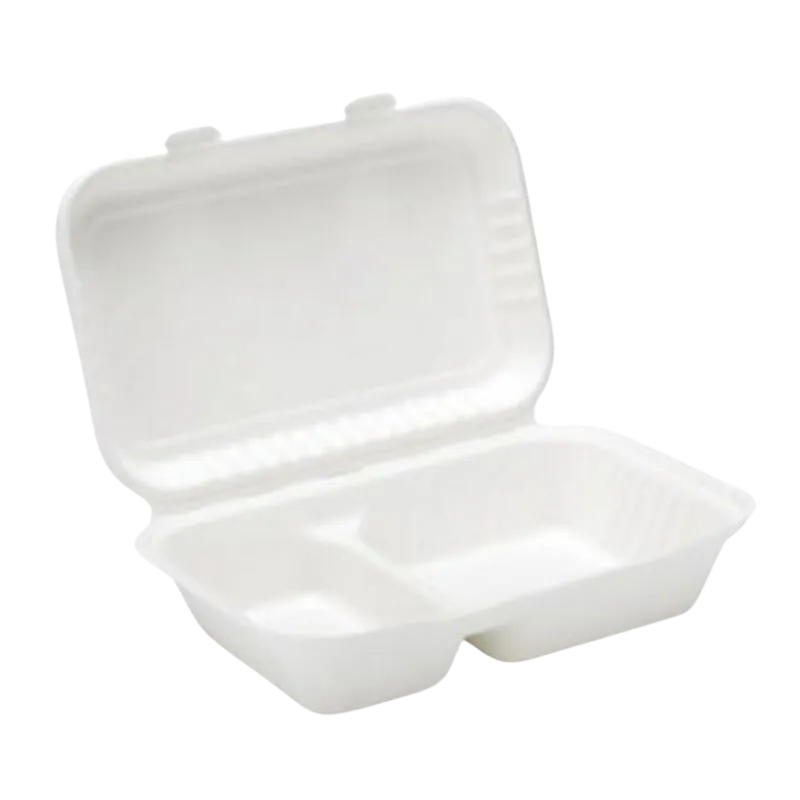9″ X 6″ Bagasse Biodegradable 2 Compartment Food Container. These food containers are Compostable and Biodegradable, manufactured from the waste fibre left after sugarcane has been pressed for juice.
