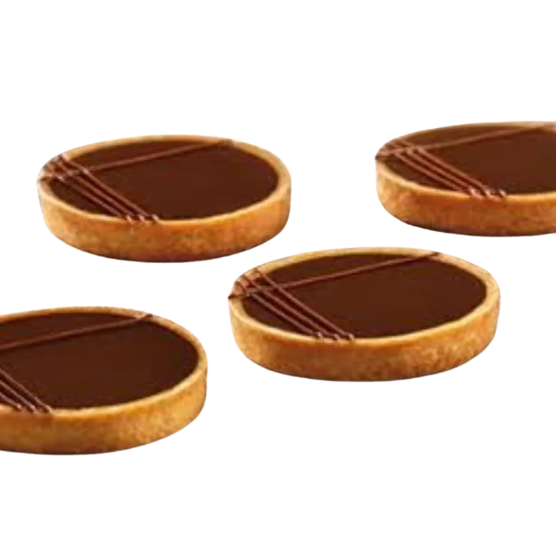 Pure butter pastry case with a thin speculoos biscuit layer, filled with rich chocolate ganache with a chocolate decoration.