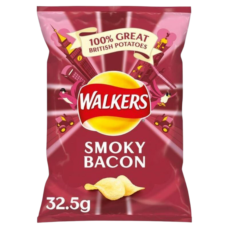 Smoky bacon flavour crisps made from 100% British potatoes and cooked in sunseed oil wich is naturally lower in saturates. Contains no artificial colours or preservatives. Walkers harvest only the finest potatoes from over 80 farms around Britain. The nation’s favourite crisps. Each retail bag is 32.5g. There are 32 bags in each wholesale case.